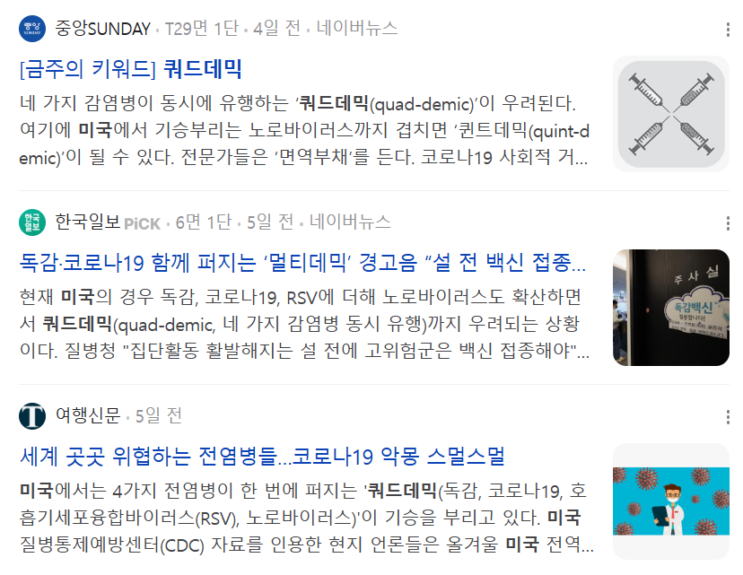 최근 미국에서는 독감, 코로나19, RSV, 노로바이러스가 동시에 확산되면서 쿼드데믹이라는 용어가 자주 사용되고 있습니다.