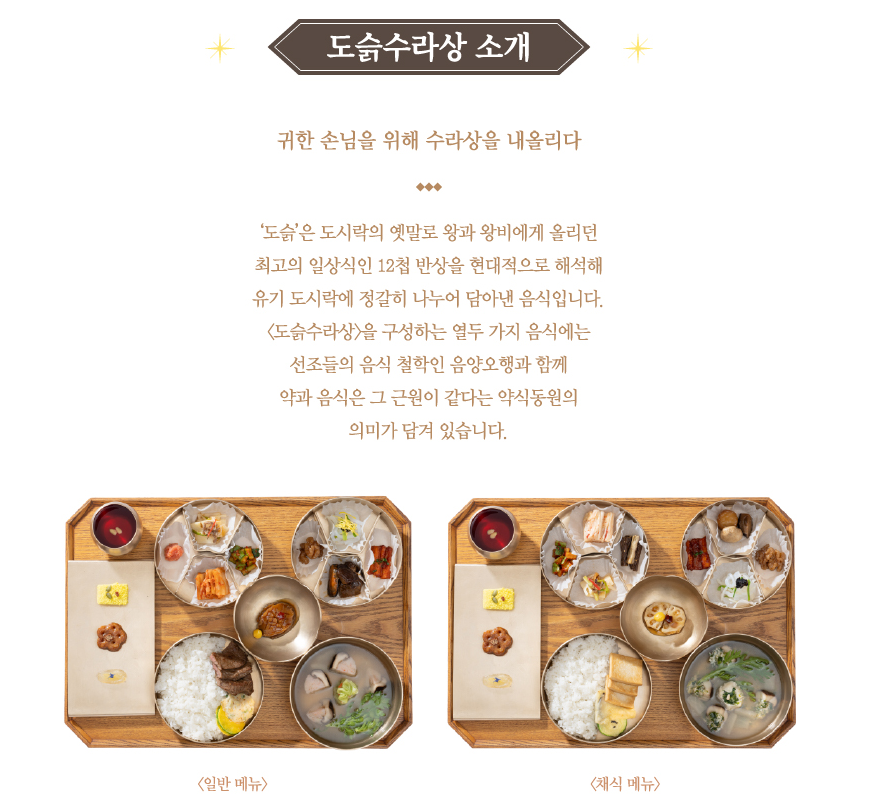 ‘도슭’은 도시락의 옛말로 왕과 왕비에게 올리던 최고의 일상식인 12첩 반상을 현대적으로 해석해 유기 도시락에 정갈히 나누어 담아낸 음식입니다.