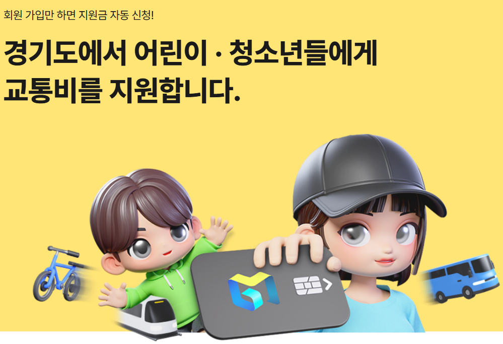 회원 가입만 하면 지원금 자동 신청! 경기도에서 어린이 · 청소년들에게 교통비를 지원합니다.
